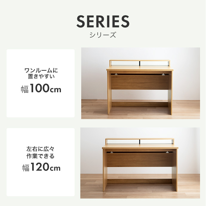 幅120cmで天板を広く使える、ゆとりのあるサイズ感。ノートパソコンや書類を広げても余裕があり、作業スペースをしっかり確保できます。在宅ワークやデスクワーク用としても使いやすくおすすめです。