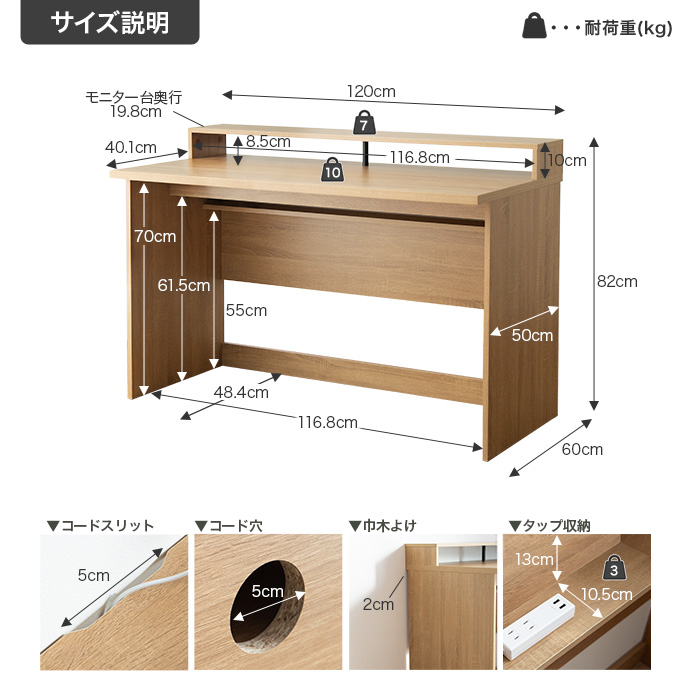 耐荷重 【天板】約10kg、【モニター台】約7kg、【タップ収納】約3kg