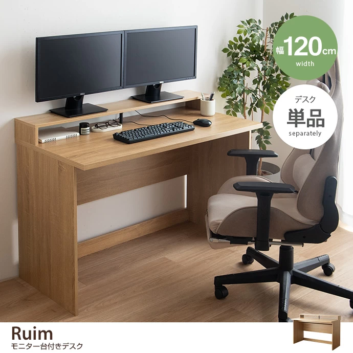 Ruim ルイム 幅120 デスク モニター台付き 机 PC パソコン オフィス ワーク デュアルモニター おしゃれ おすすめ 安い 勉強机 作業台 棚 配線 整理 コード収納 ワンルーム 一人暮らし リビング 書斎 ディスプレイ 在宅 リモート テレワーク スマート 幅広 木目調 学生 キッズ 子供 ゲーム部屋 ゲーミング