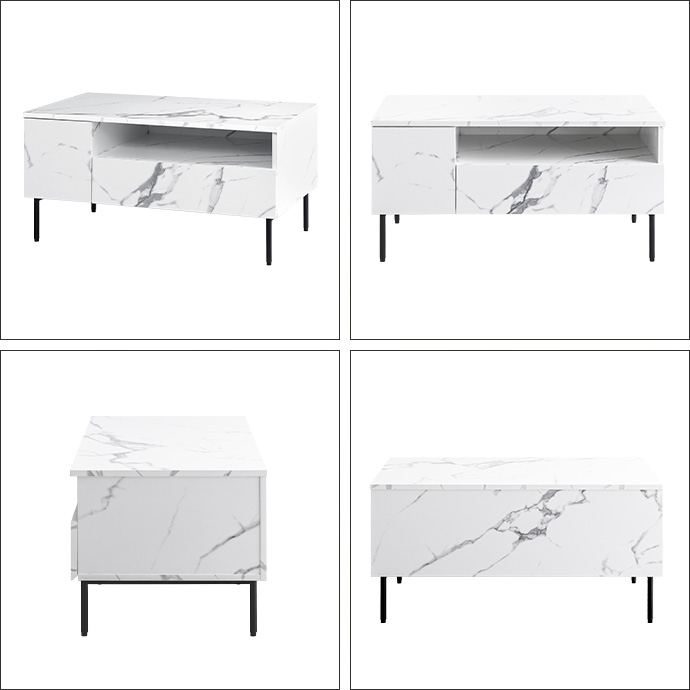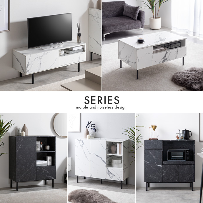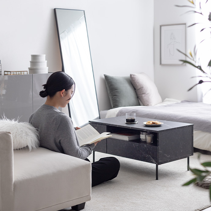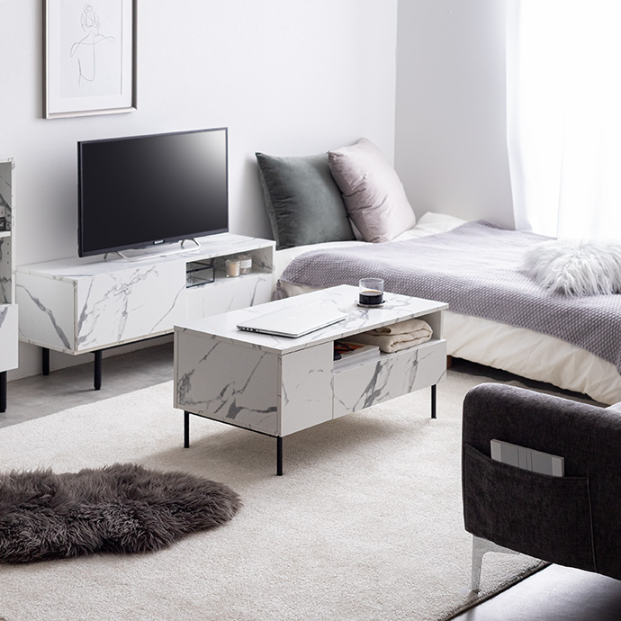 置くだけで自然と洗練された空間になる、大理石調センターテーブル。凛とした佇まいが、まるで雑誌の1ページのように上質なリビングを演出します。浅型・深型・オープンの3種類の収納を備え、テーブル周りの小物まとめて収納可能。すっきりと整った、モダン空間をお作りいただけます。