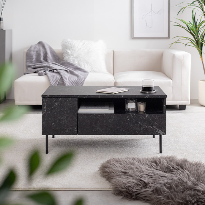高級感漂う大理石調の天板が、リビングを上質なモダン空間へと格上げするセンターテーブル。ワイドな浅型の引き出しにはノートPCや雑誌を、深型引き出しには高さのあるアイテムをすっきり収納いただけます。さらにオープン収納にはリモコンやティッシュなど日常使いのアイテムを配置でき、3タイプの収納スペースは用途に合わせた使い分けが可能。生活感を隠しながら使い勝手も抜群な、デザインと実用性を兼ね備えた一台です。