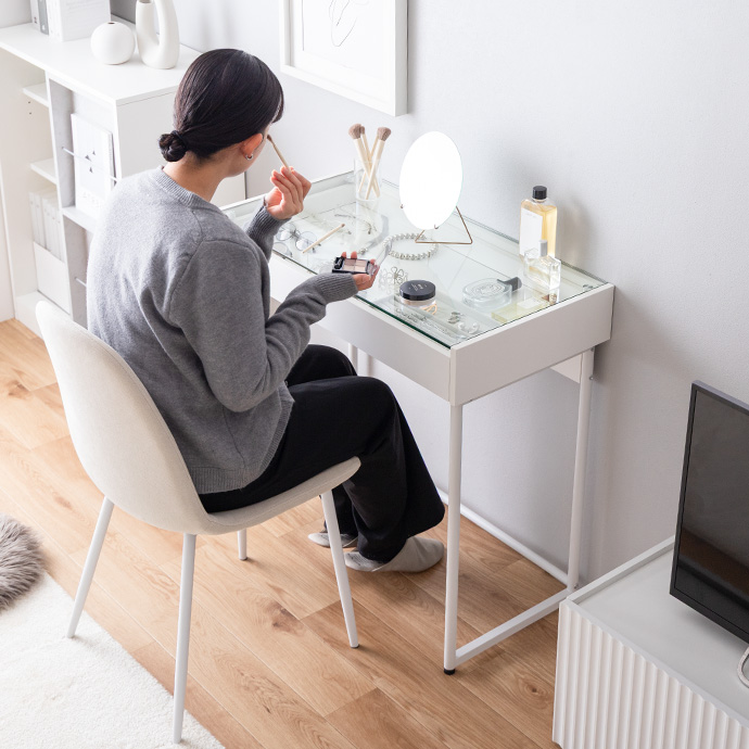 ガラス天板の下に引き出しを配置することで、お気に入りのコスメやアクセサリーがディスプレイできる、まるでショーケースのような美しいガラスデスク。いつも使うものを美しく飾りながら収納でき、デスク自体がお部屋のアクセントに。毎日の身支度やデスクワークが、お気に入りに囲まれた特別な時間に変わります。