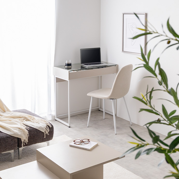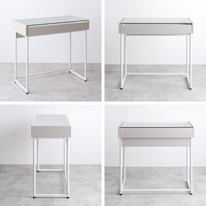 限られたスペースにもすっきり収まる幅80cm×奥行40cmのコンパクト設計。ガラス天板は光を通すため、視覚的な抜け感が生まれ軽やかな印象に。ワンルームや書斎の壁際にもすっきり置いていただけます。