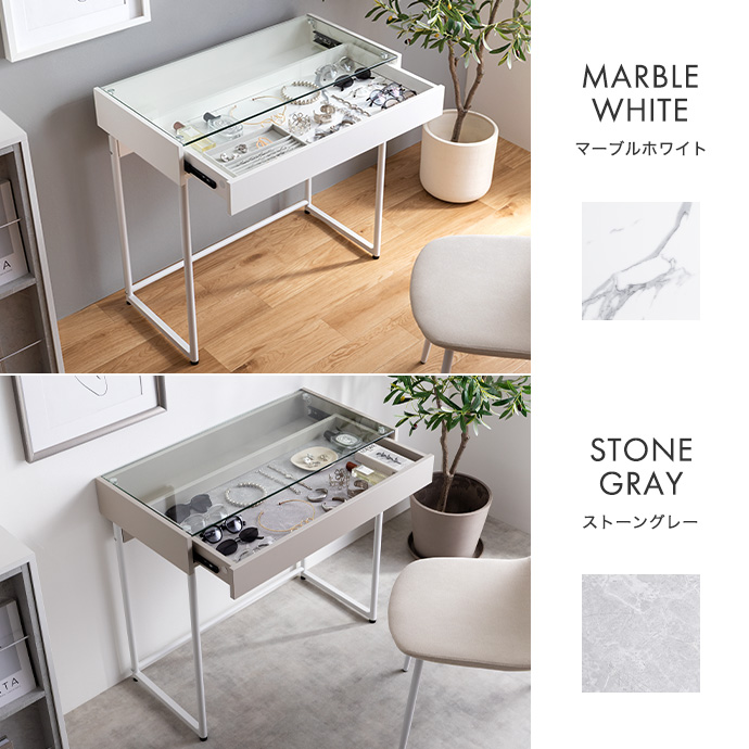 ガラス天板の下に、お気に入りのコスメやアクセサリーを美しくディスプレイできる、ショーケースのようなデスクが登場しました!見せる収納でデスク自体がお部屋のアクセントに♪天板は強化ガラスを採用しており安心で、さらに引き出しは滑らかに動くスライドレールによりスムーズに開閉可能です!コンパクトでスリムな設計なので、ワンルームなどスペースに余裕のない空間にも圧迫感なく置いていただけます♪