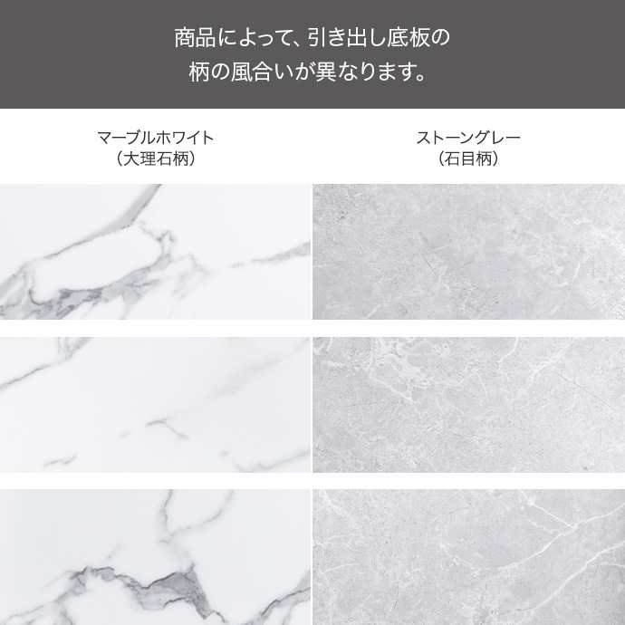 引き出し底板には、上品なストーン柄を施しました。コスメやアクセサリーを置けば、まるでショップのディスプレイのよう。明るく清潔感のあるホワイトマーブルと、落ち着いた大人の雰囲気のストーングレーの2色をご用意しました。