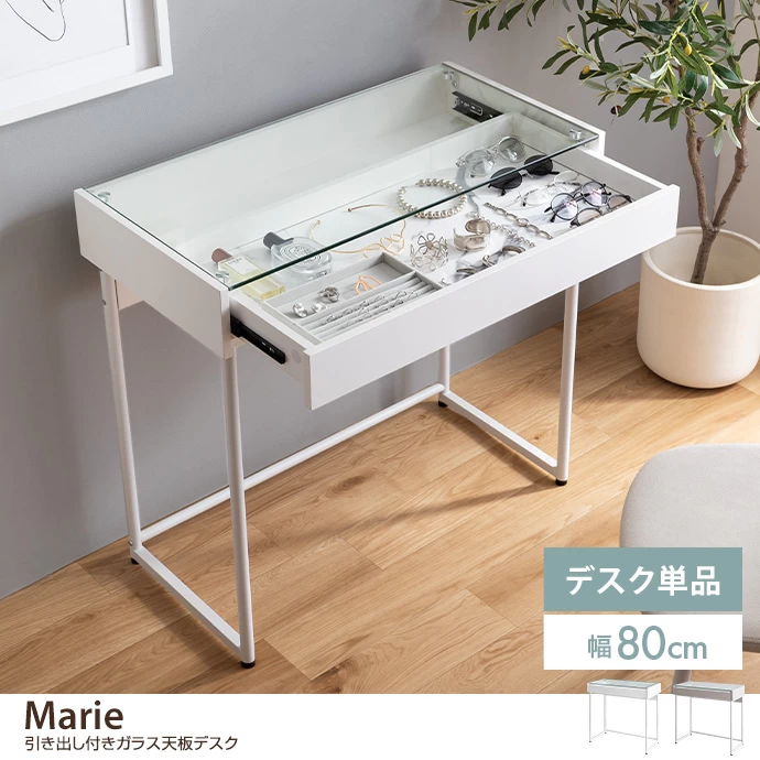 Marie マリー 幅80 デスク 机 パソコンデスク おしゃれ おすすめ 安い テーブル ディスプレイ ガラス 収納 引き出し 可愛い 1人暮らし ワンルーム 化粧品 ドレッサー 勉強机 大理石調 マーブル ストーン サロン コンパクト 化粧台 コスメ メイク 書斎 ワークデスク ネイルデスク