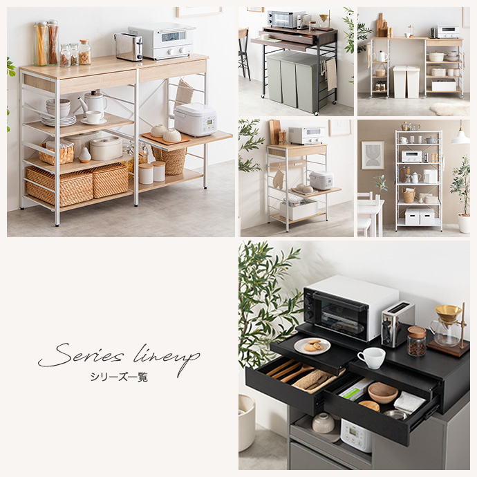物が多く散らかりがちなキッチンスペースにピッタリな大容量の収納力。電子レンジや炊飯器、ケトルなどのキッチン家電から、食器や食料品などのキッチン用品も1つにまとめて収納していただけます。また、天板スペースも広々使え、効率よく作業していただけます。