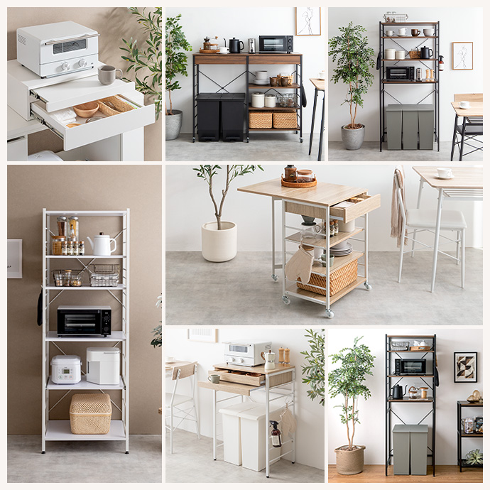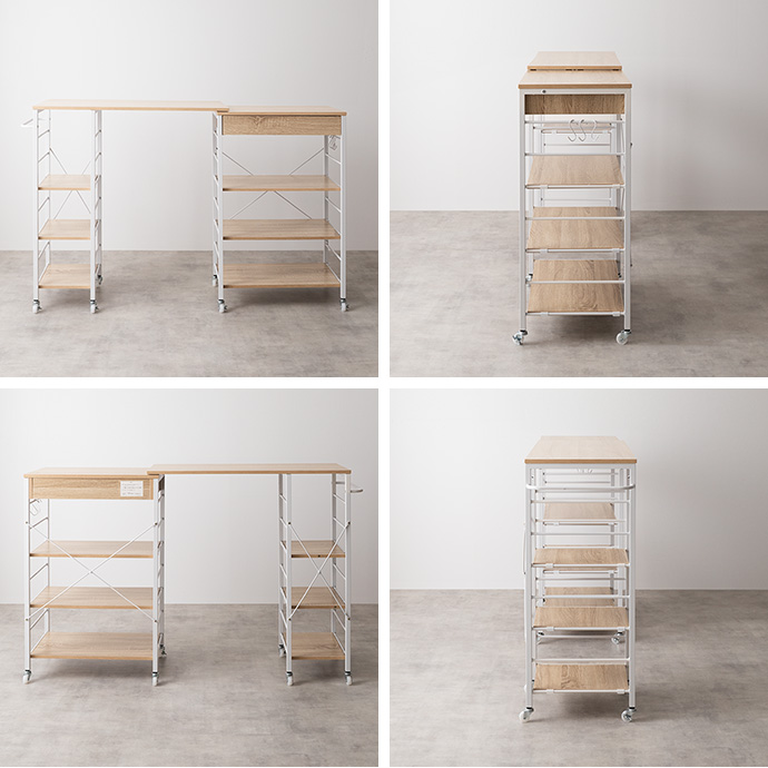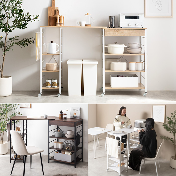 置く場所に合わせて天板の広さを変えられる、伸縮レンジラック。4箇所の収納スペースを備えており、キッチン家電をはじめ、食器や食料品、調理器具など、この1台にまとめて収納できます。普段はコンパクトに置いて、作業に応じて天板をサッと拡張といった使い方もでき、キッチンでの作業時間も快適に。さらにキャスターが付属しているため、日々のお掃除や模様替えもスムーズに行えます。