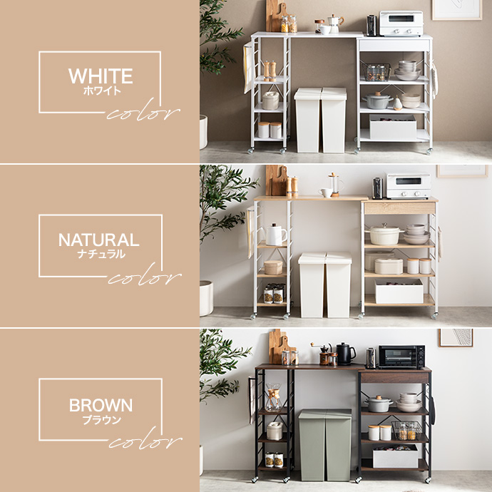 最大144cmまで広がる天板は、キッチン家電の設置や作業台としてもゆったり使える広さ。必要に応じて伸縮できるため、レイアウトを柔軟に変えながら、シーンに合わせて快適に使い分けできます。