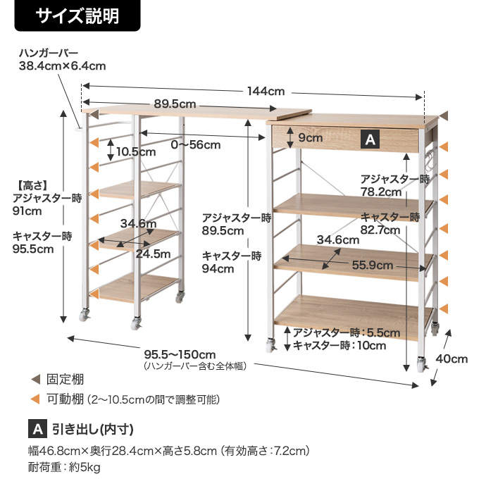 サイズ 幅95.5~150cm×奥行40cm×高さ(キャスター装着時):95.5cm (アジャスター装着時):91cm
