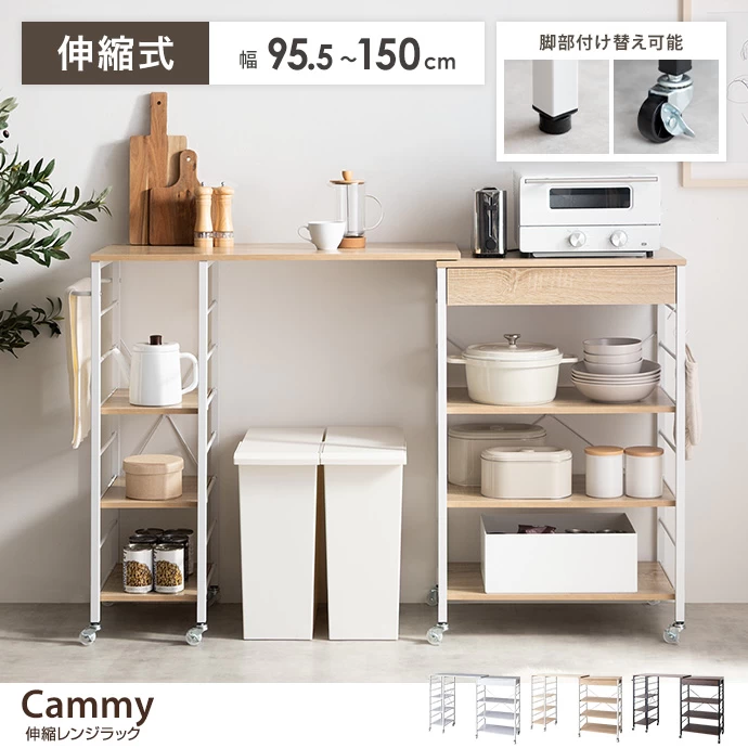 Cammy キャミー 幅95.5 幅150 レンジ台 伸縮 レンジラック レンジボード カウンター キッチン収納 キッチンラック キッチンボード アイランド ラック シェルフ 間仕切り 食器棚 棚 ワゴン おしゃれ おすすめ 安い 伸縮 ゴミ箱上 キャスター付き 調理台 作業台 伸長 伸びる 天板拡張 大容量 左右設置可能 背面 カップボード ゴミ箱 台所 引き出し 可動棚 家電 炊飯器 電子レンジ バーカウンター デスク S字フック