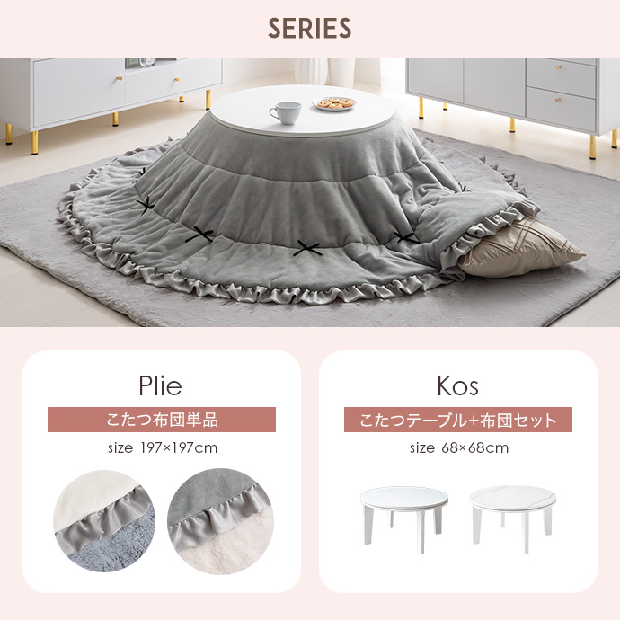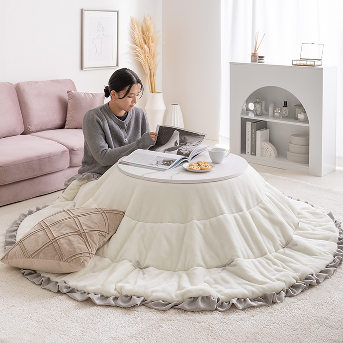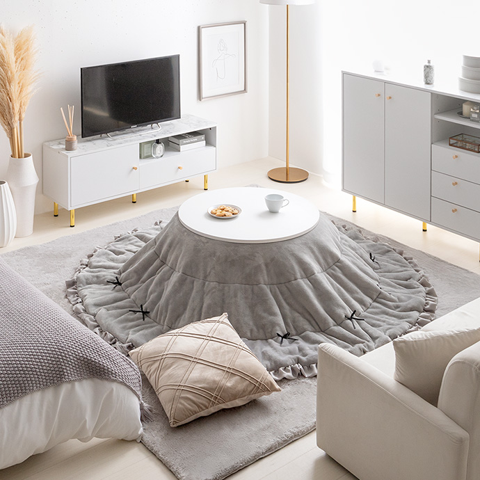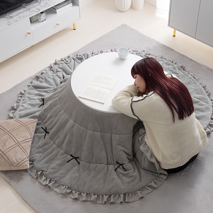 ふんわり広がるフリルに、可憐に結ばれたリボン。2つが調和することで、シンプルでありながら心ときめくデザインに仕上がり、たちまちインテリアの主役に。こたつを置いても、派手すぎない大人可愛い上品な空間が出来上がります。