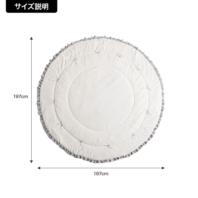 やわらかな色合いとシンプルなデザインに、上品なフリルとさりげないリボンを添えたこたつ布団。派手すぎない大人可愛いデザインとリバーシブルで使える2つの色味は、お部屋に溶け込むように馴染み、気分に合わせて使い分けが可能です。円形が調和する、柔らかな表情をお楽しみください。
