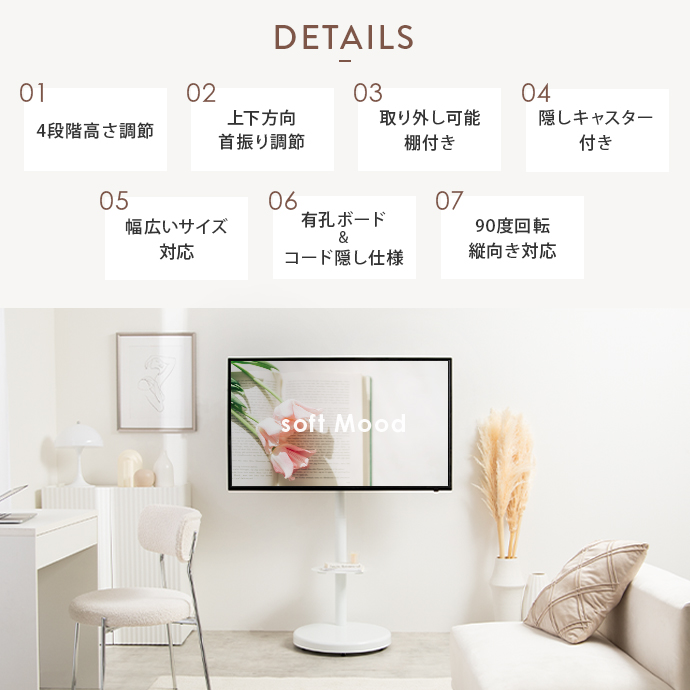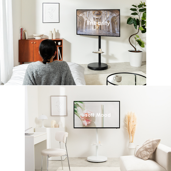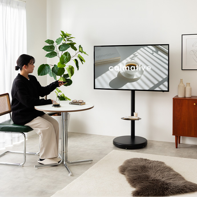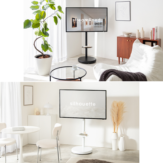 便利な機能をたっぷり詰め込んだキャスター付きテレビスタンド。高さや角度の調節、AV機器の収納やディスプレイができる棚付きで、使いやすさも抜群。さらにデザイン性にも優れており、丸みを帯びたフォルムとすっきりとしたシルエットで、空間全体を優しく引き締め、様々なインテリアに調和します。