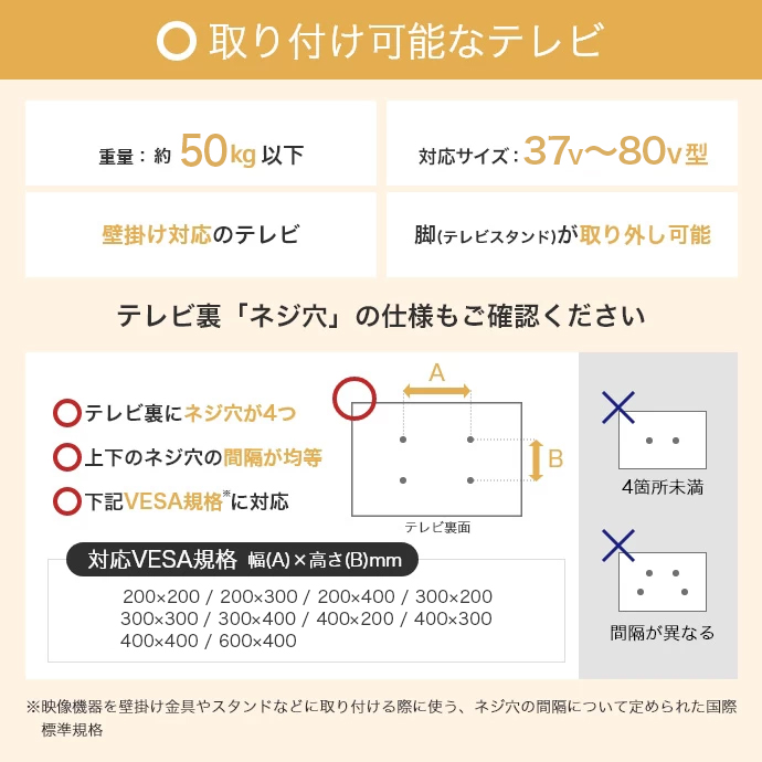 37v~80vまでの幅広いテレビサイズに対応。本体耐荷重は約50kgと安心してお使いいただけます。お手持ちのテレビの重さをご確認ください。