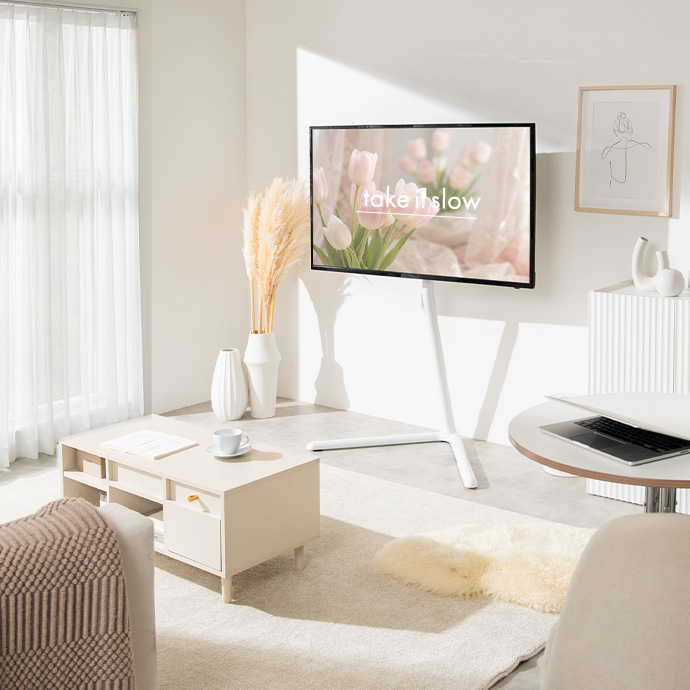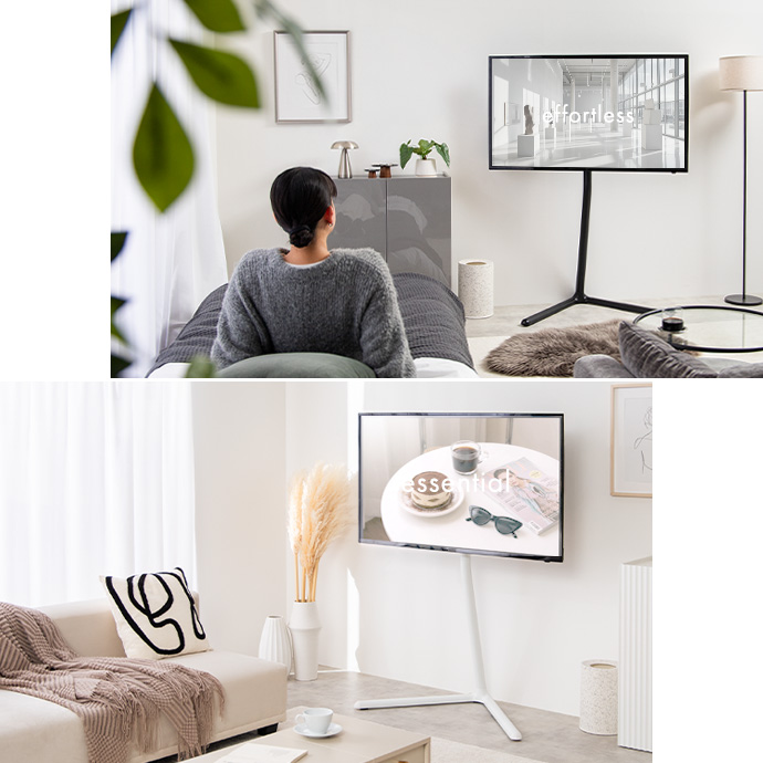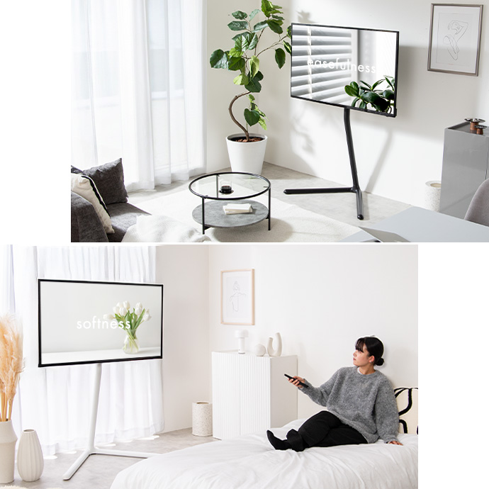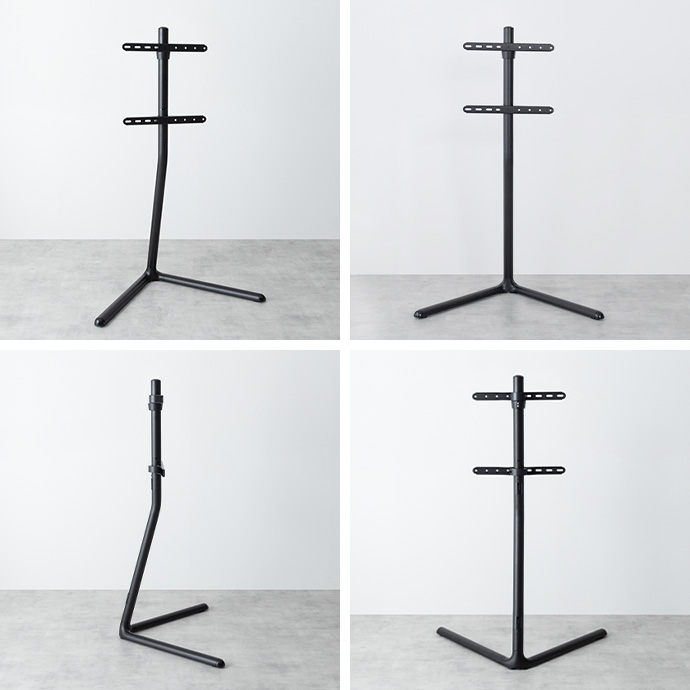ミニマルデザインでスタイリッシュなテレビスタンド。テレビを好きな場所に、アートのようにディスプレイできます。テレビの高さと左右の角度は調節可能。ちょうど良い高さと角度に調節できるため、日々の生活を快適に。洗練された美しい佇まいと機能性でリビングを特別な空間にしてくれます。