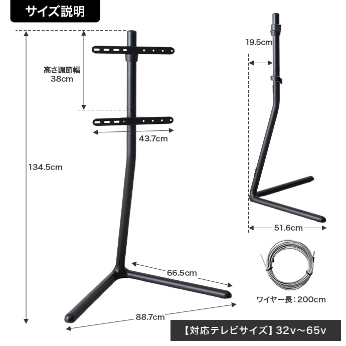 32v~65vまでの幅広いテレビサイズに対応。本体耐荷重は約40kgと安心してお使いいただけます。お手持ちのテレビの重さをご確認ください。