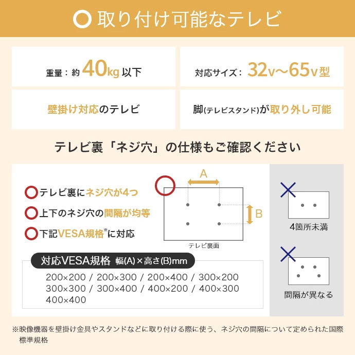 ※32~65型テレビのVESA規格に対応しています。