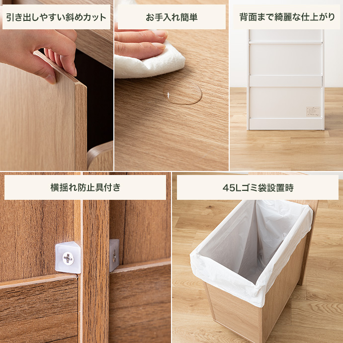 ゴミ袋は上から被せるだけでセットは簡単。前板側にはスリットが入っているため、袋の端がよれることもなく綺麗にセットしていただけます。またキャスター付きでゴミ箱ごと引き出すことができるため、重たいゴミが入っている時も、袋を取り換える時も、ラクラク快適です。