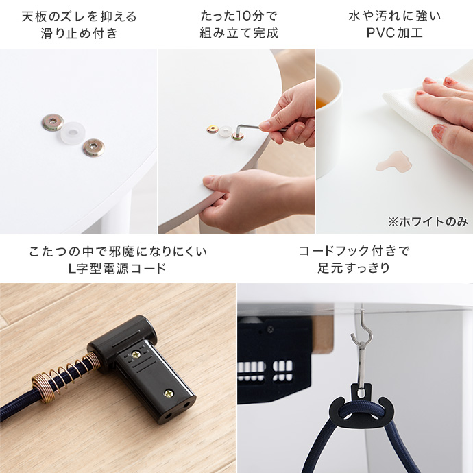 材質 | 【テーブル】 ホワイト:天板:パーティクルボード(PVC貼り)、中天板:パーティクルボード(紙貼り) マーブルホワイト:天板・中天板:パーティクルボード(紙貼り) ヒーター:MS-303H(B) 300W石英管ヒーター(中間スイッチ) 【布団】 側生地:ポリエステル100%(表地:フランネル/裏地:フェイクラビットファー) 中材:ポリエステル100% |