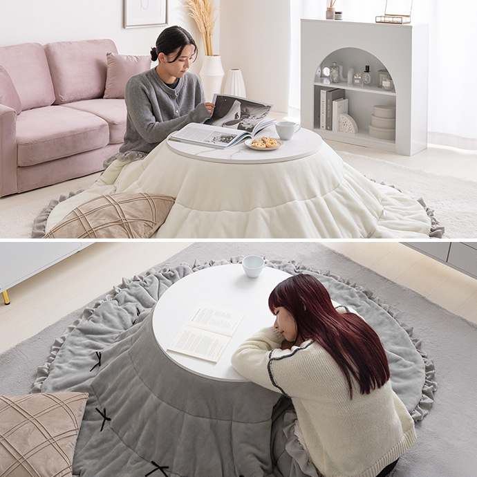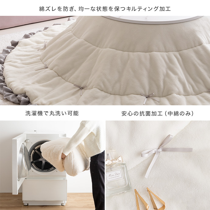 ふんわり広がるフリルに、可憐に結ばれたリボン。2つが調和することで、シンプルでありながら心ときめくデザインに仕上がり、たちまちインテリアの主役に。こたつを置いても、派手すぎない大人可愛い上品な空間が出来上がります。