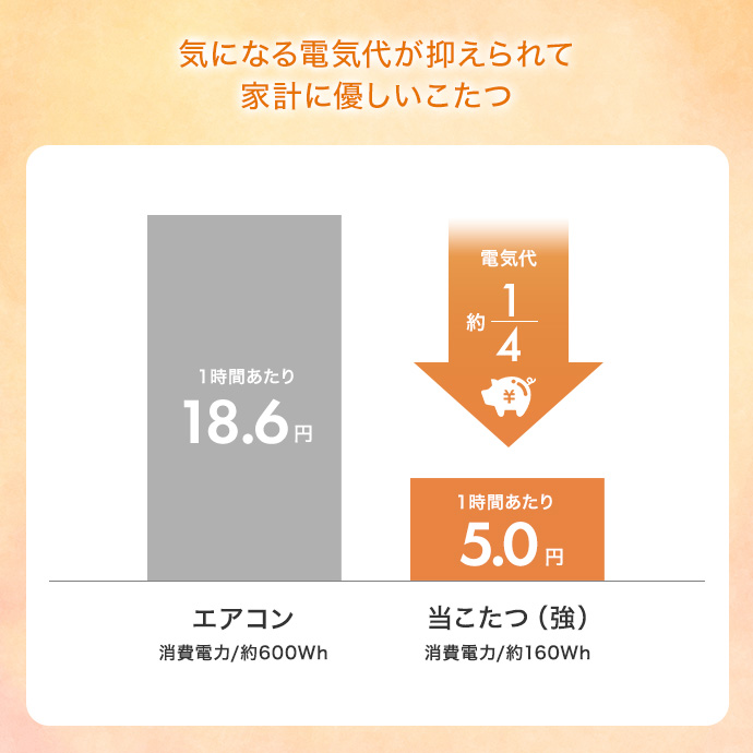 一人暮らしの方やワンルームにお住まいの方にもぴったりなコンパクトサイズのこたつセット。角がなく省スペースで置けるので、置き場所を選ばずすっきり置くことが可能です。また、こたつ布団は薄掛けタイプなので、かさばりにくく圧迫感を抑え、お部屋を広くすっきり見せます。