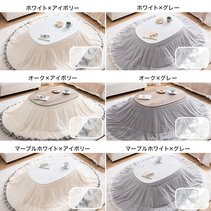 6種類の組み合わせから選べるこたつセット。テーブルはシンプルで合わせやすいホワイト、リアルな木目を再現したオーク、上質な雰囲気のあるマーブルホワイトの3色。布団は落ち着きある大人ニュアンスカラーの2色をご用意。ご自宅の空間にぴったりなお好みのセットをお選びください。