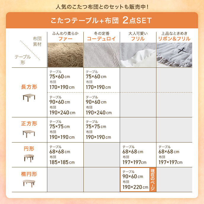 商品名 【楕円形:天板 90cm×60cm】Kos こたつ&掛け布団2点セット