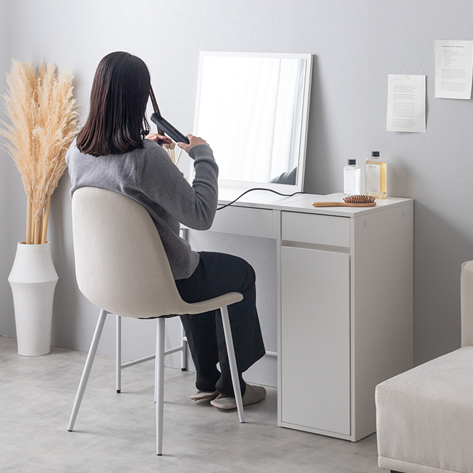 毎日の支度がもっと快適になるよう、使いやすさにこだわりました。取り外しが可能な、上半身まで映る大きなミラー。電源タップを格納できるミラー置き場。ゆったり使える広めの天板に、コスメやボトル類を整理できる引き出し&扉収納で、大容量収納を実現。