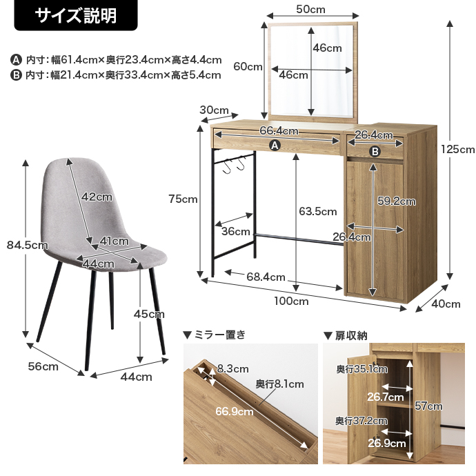 | サイズ | 【ドレッサー】幅100cm×奥行40cm×高さ125cm 【チェア】幅44cm×奥行56cm×高さ84.5cm(座面高:45cm)     |