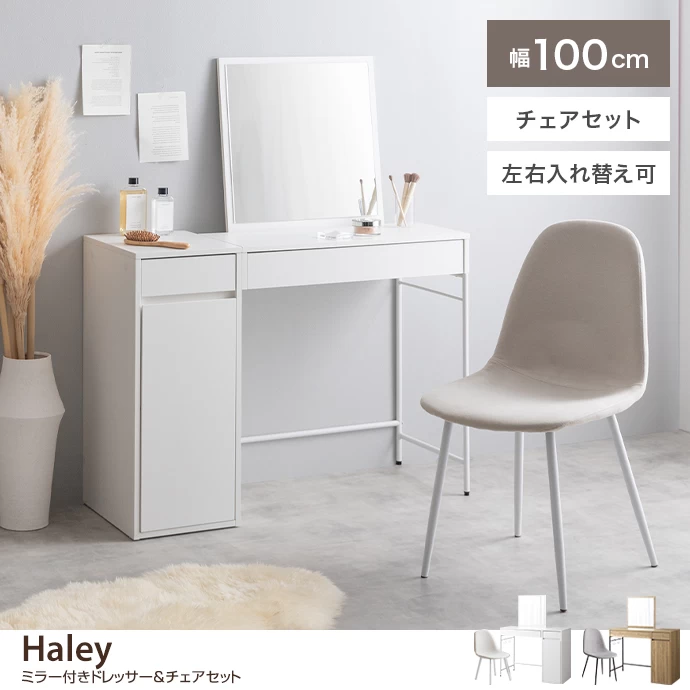 広々と使える天板とワイドミラー、たっぷり収納が魅力のドレッサー+チェアセット。幅100cmの天板とワイドミラーで、毎日のメイク時間を快適に。ミラーは取り外しでき、収納棚は組み立て時に左右の入れ替えも可能。お部屋のレイアウトや利き手に合わせて自由に配置できます。また、ミラー立てかけ利用時にはミラーを裏向けることでデスクとしてお使いいただくことも。