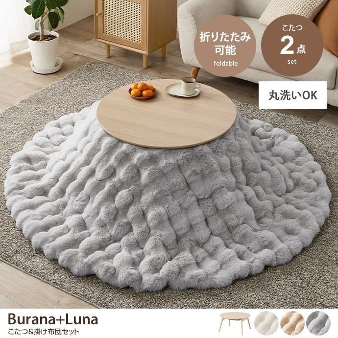 ころんとした丸みのあるフォルムが可愛らしいこたつテーブルと、やさしい肌触りのこたつ布団を組み合わせた2点セット。脚を折りたたむことができるコンパクトなテーブルは、ワンルームやスペースに限りのあるお部屋でも圧迫感を感じにくく、日常使いにちょうどいいサイズ感です。また布団には、まるでうさぎの毛並みのようなラビットファー調の生地を採用。贅沢な高密度仕上げでなめらかな肌触りが、くつろぎ時間をより心地よく演出します。さらに洗濯機で洗えるため、お手入れがしやすく、毎日の暮らしに取り入れやすいのも魅力です。